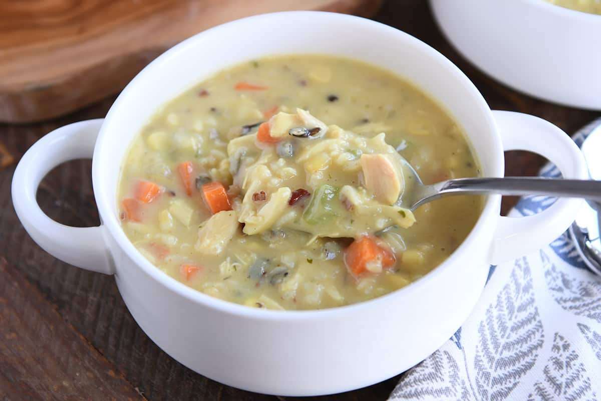 - Add the cooked rice, almonds, chicken and half-and-half. Bring the soup to a gentle simmer and cook for 30-45 minutes, stirring occasionally to prevent sticking. Moderate the heat so the soup doesn't boil vigorously. It will thicken as it simmers.