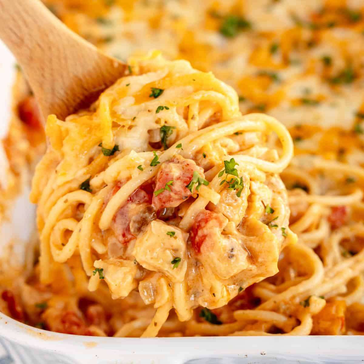 Chicken spaghetti casserole comfort food heaven! It combines tender chicken, a creamy, dreamy, savory homemade sauce with a hint of spice and 3 kinds of cheese.