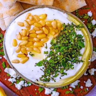 - Break the feta into smaller chunks and place them in the food processor. Add the dried oregano, grated garlic, pepper, yogurt, olive oil, and lemon juice.