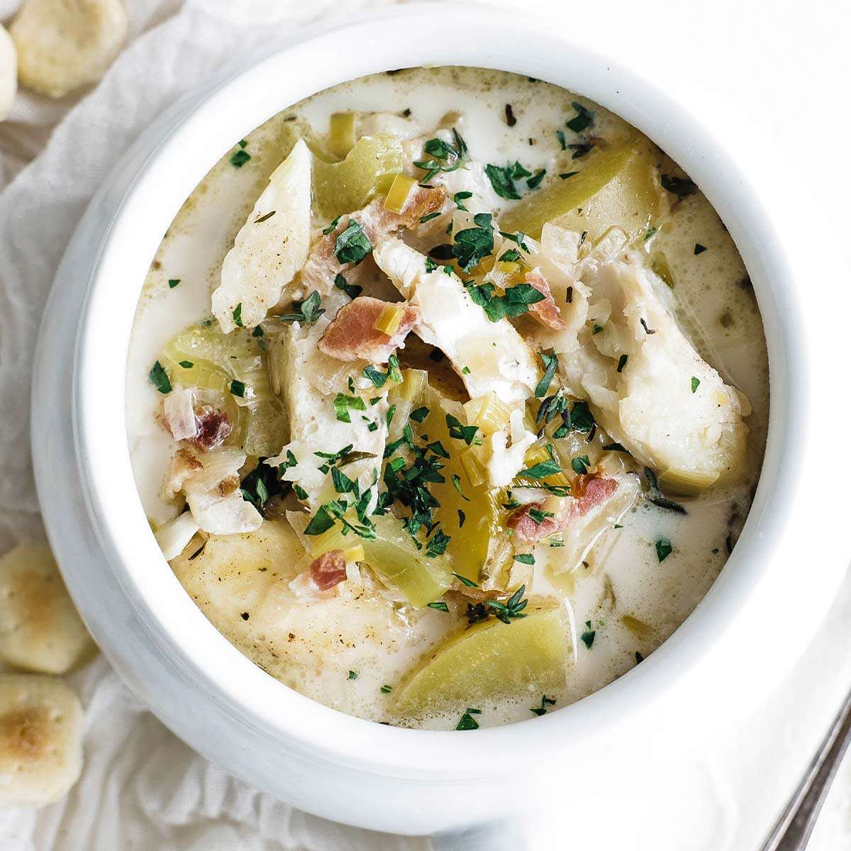 You will love this Fish Chowder Recipe that is loaded with Yukon potatoes, crispy bacon, fresh fish, and herbs in a delicious creamy broth.