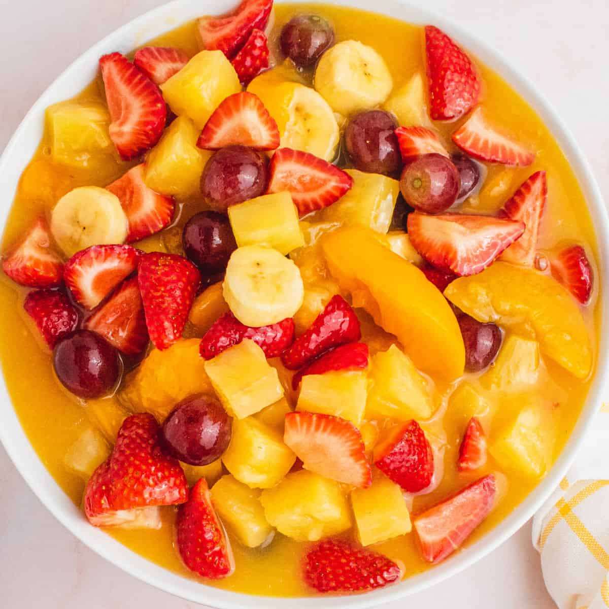 - Cover with plastic wrap and chill for at least 30 minutes or until ready to serve. Transfer the fruit salad to a serving bowl or portion it into individual cups for serving. Garnish with a sprig of fresh mint if desired.