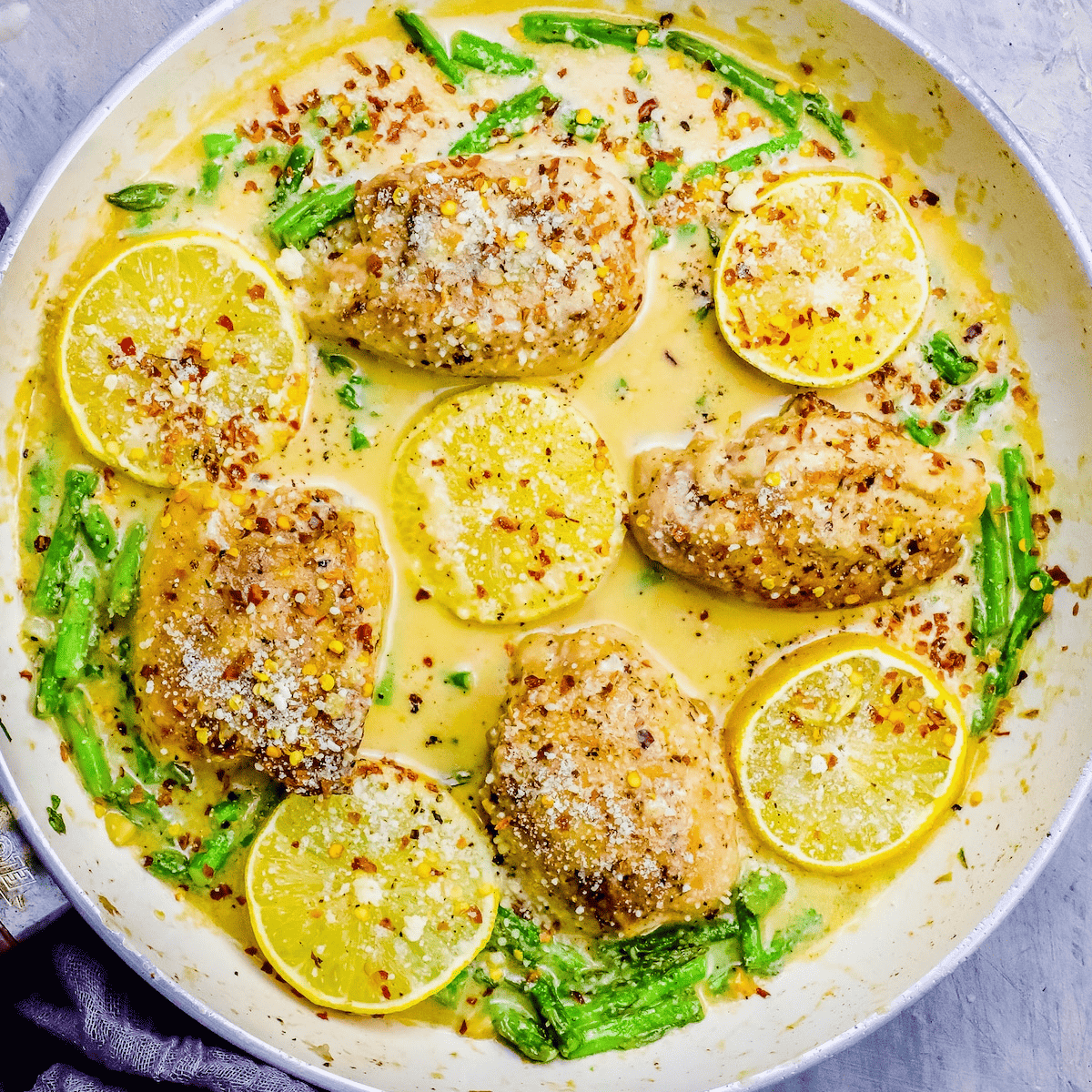 Paleo and Keto diet friendly One Pot Creamy Lemon Garlic Chicken and Asparagus is a delicious low carb dinner that is also great over rice or pasta, or just over grilled vegetables for a creamy rich meal everyone loves! Bursting with lemon garlic flavor that is so delicious you'll want to lick the pan!