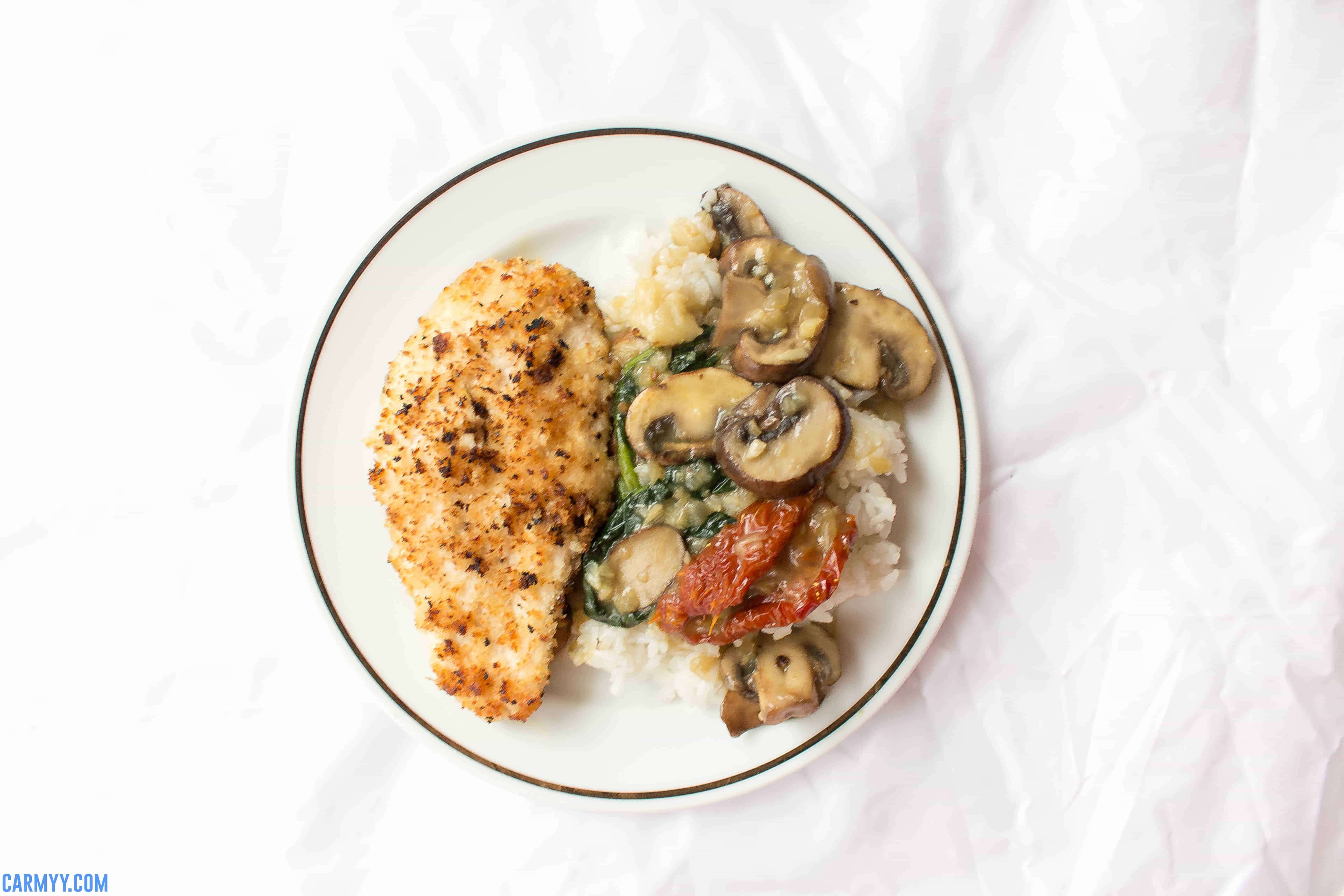 - 2 chicken breasts halved, coated with panko, salt, pepper, and parmesan cheese