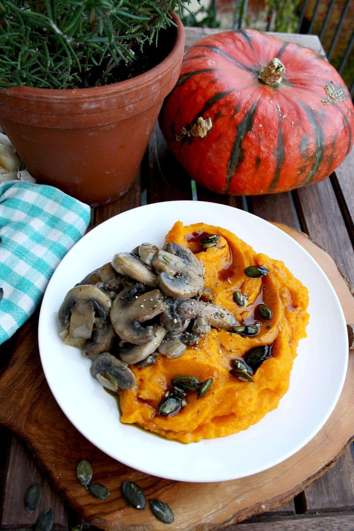 Creamy Pumpkin Puree with Mushrooms and Garlicky Pumpkin Oil: a 15 minutes easy recipe for a seasonal vegetarian dinner, packed with fall flavors.
