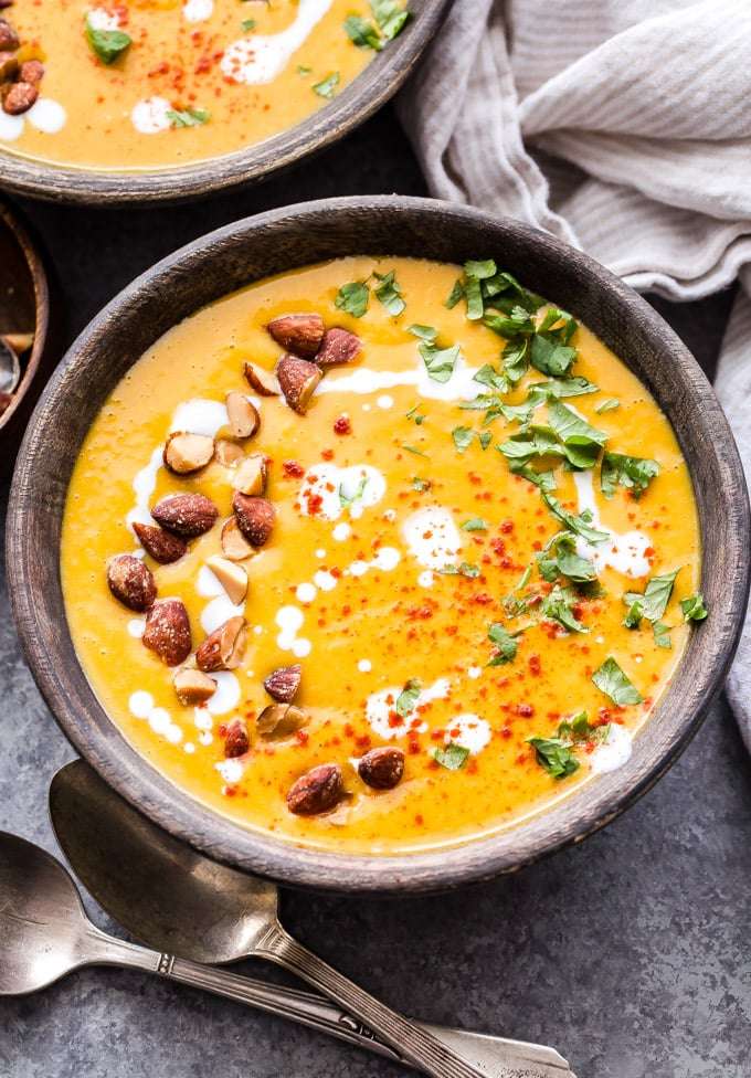 - Once the soup is puréed add the Greek yogurt to the soup in the blender and blend until incorporated and smooth. Serve the soup topped with chopped smoked almonds, cilantro, a drizzle of Greek yogurt and an extra sprinkle of smoked paprika.