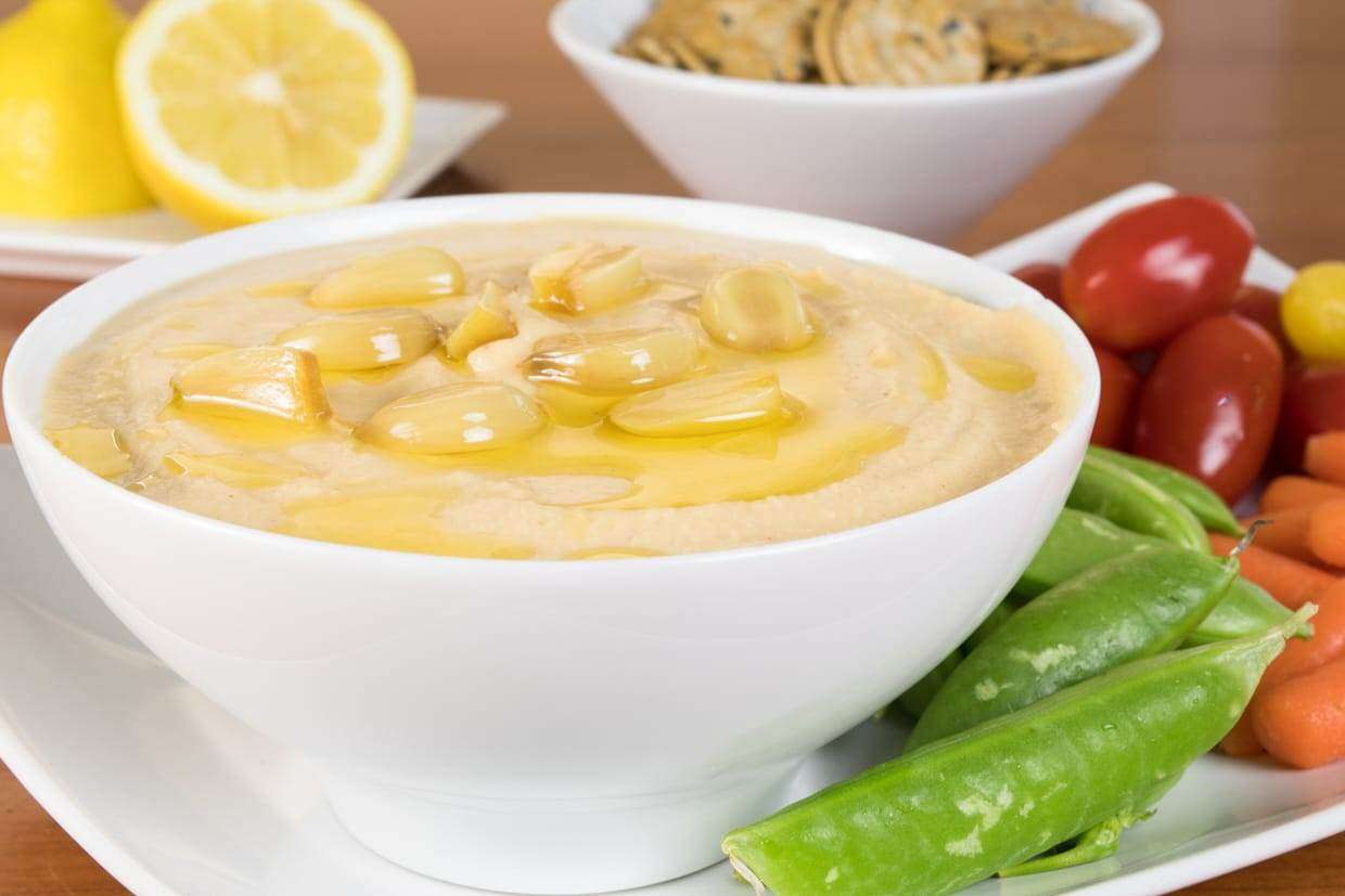 - When you are ready to serve the hummus, drizzle the olive oil and sliced roasted garlic on top. Serve with veggies, rice crackers, and/or pita bread. Enjoy.