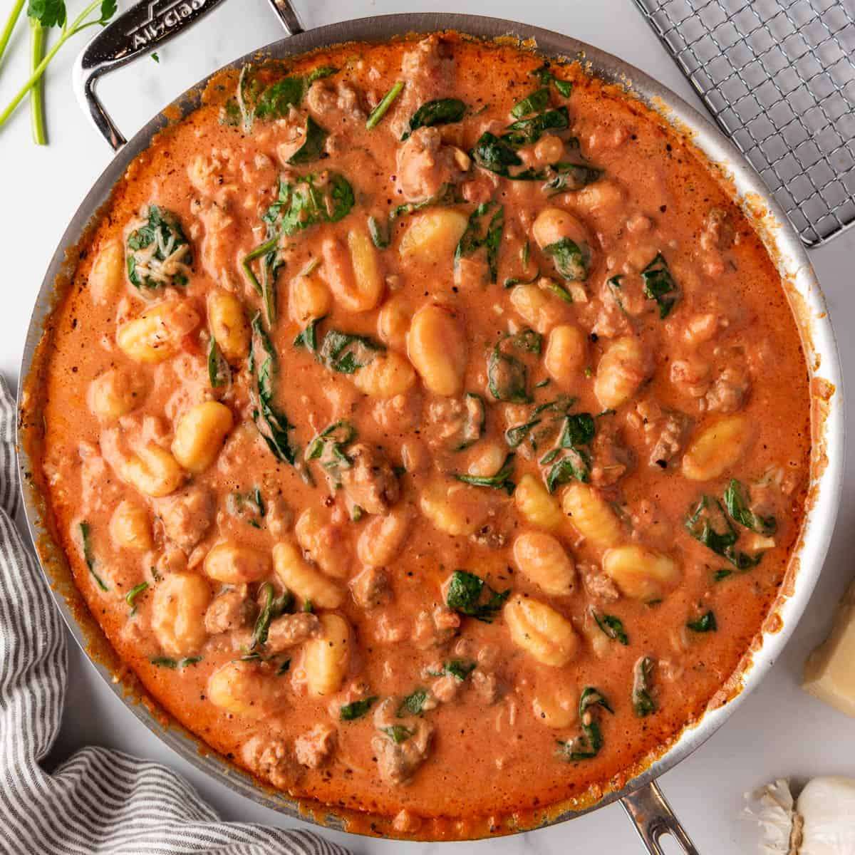 Creamy Sausage Gnocchi has a rich, creamy sauce that perfectly complements the soft, pillowy gnocchi and the spicy, savory bite of Italian sausage! Perfect for any day of the week, this dish combines simple ingredients with rich Italian flavors to create a meal that's a huge hit with the whole family!