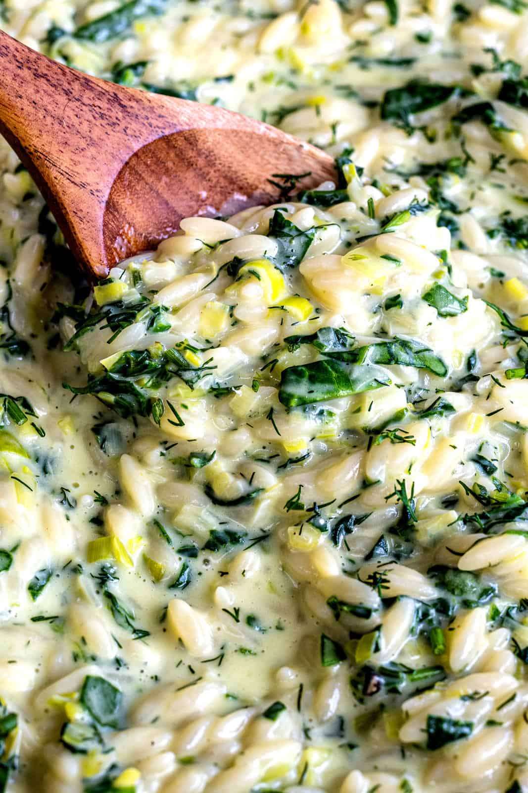 Deliciously creamy Spinach Orzo! This quick recipe combines dill, spring onions, leeks and spinach with orzo, cream and Parmesan to create an irresistible vegetarian side dish or main. This comforting orzo dish is inspired by the Greek recipe Spanakorizo. YUM!