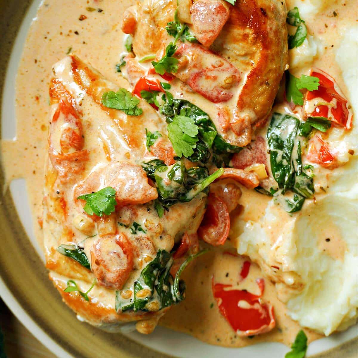Creamy Tuscan Chicken, a delicious chicken dinner recipe made with seared chicken breasts cooked in a light creamy tomato, parmesan, garlic and spinach sauce. It's a quick and really easy dish that will pamper your taste buds and bring happiness at the dinner table.