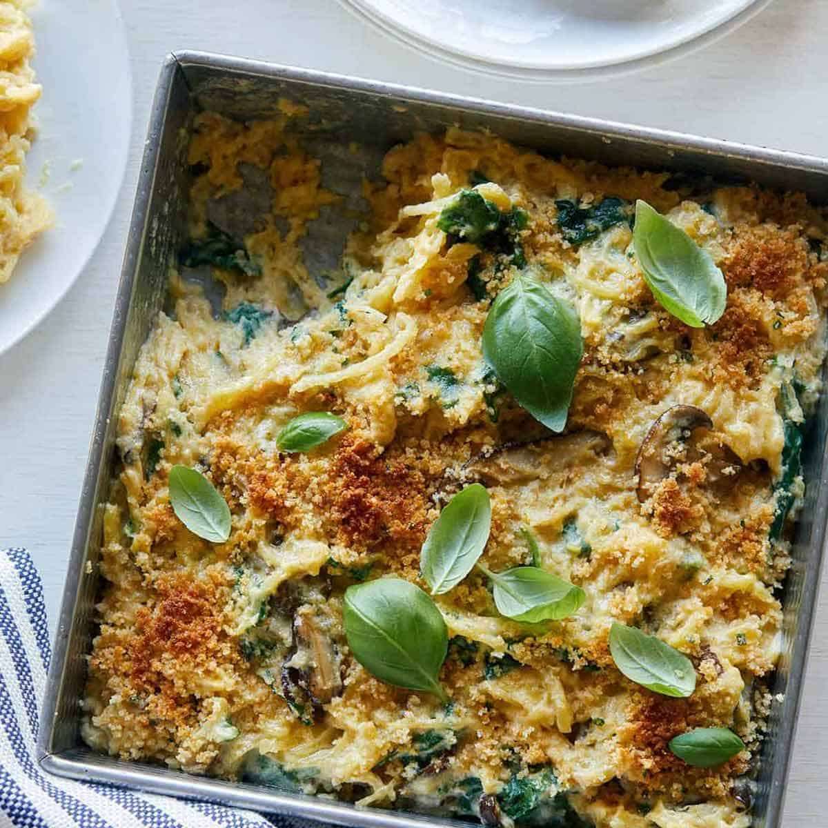 Creamy Vegan Spaghetti Squash, Wild Mushroom and Spinach Bake