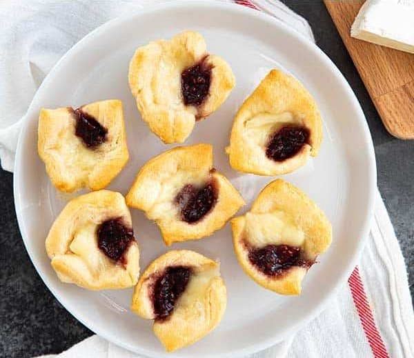 - Cut the brie into 16 pieces. (You can remove the rind if you want, but I don’t usually remove it.) Place a piece into each of the crescent cups.