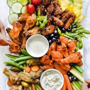 Healthier crispy baked chicken wings are dressed in four different sauces and teamed up with all the dips for a chicken wing platter that's sure to score.