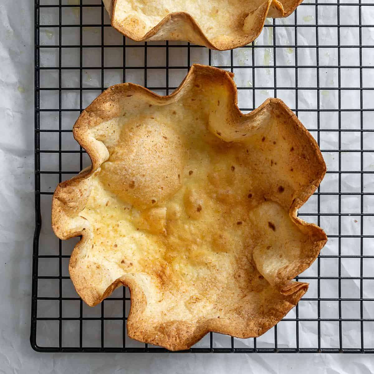 - When ready, carefully remove from the oven and remove the tortilla from the bowl. Place it on a cooling rack. It will get soggy if you leave it in the bowl to cool down.