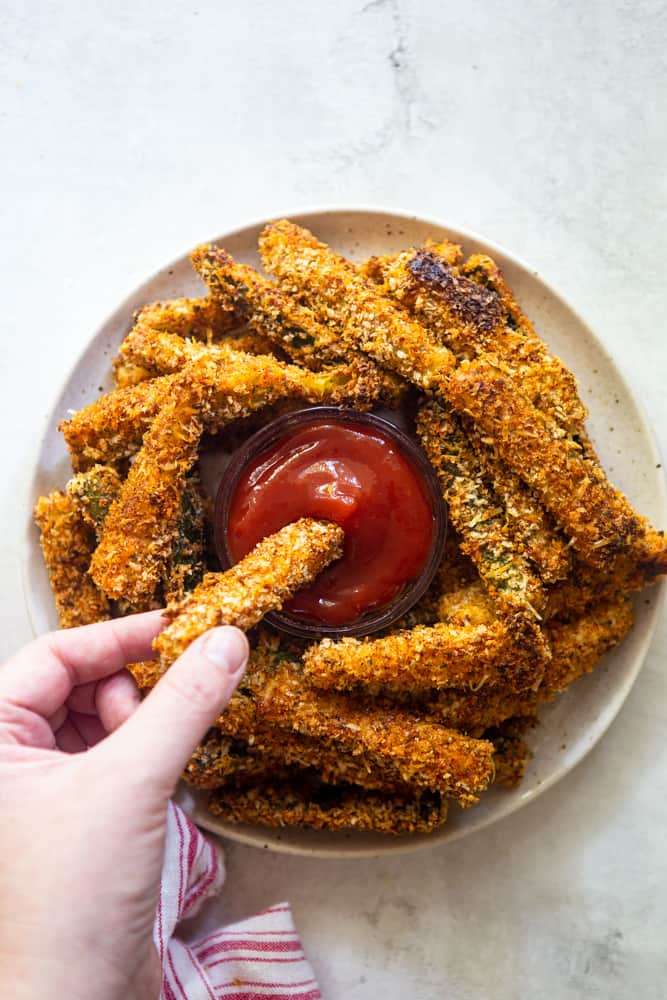 - Cut zucchini into sticks, pat dry with a paper towel. Toss zucchini in flour seasoned 1/4 tsp salt. Shake to remove any excess flour, then dip zucchini in egg.