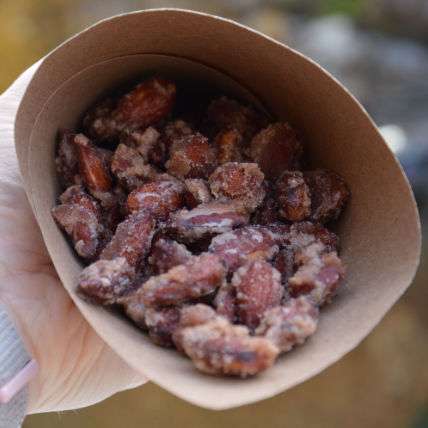 - Turn the heat to medium (I am using 6 out of 10), add the almonds and keep on stirring until the sugar carmelizes. Transfer the almonds into a backing sheet, spread them and let the ret for few minutes until the cool down.