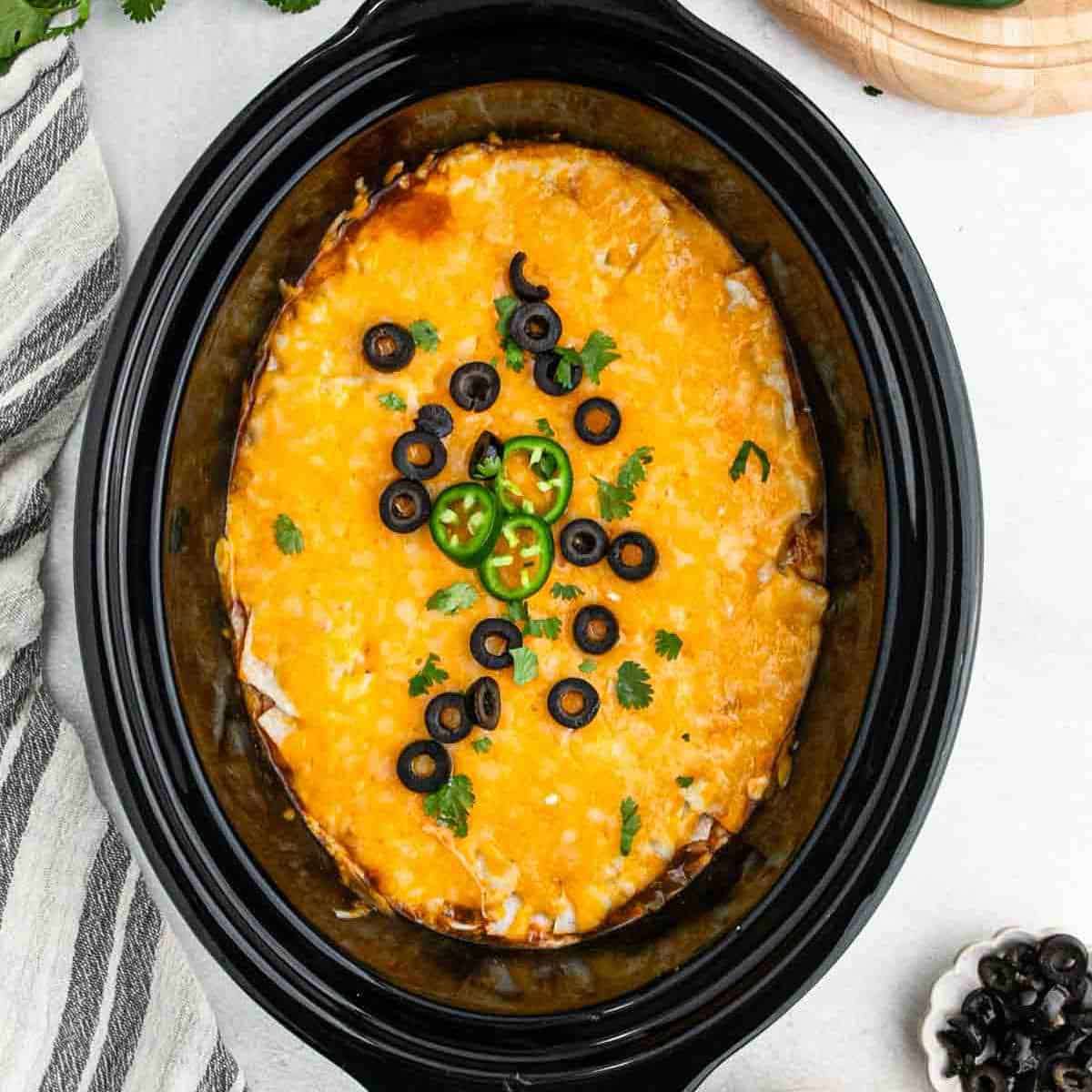 Make Crock Pot Chicken Enchiladas for an easy one pot meal. Flavorful, Tender chicken and melty cheese makes this the perfect weeknight meal.