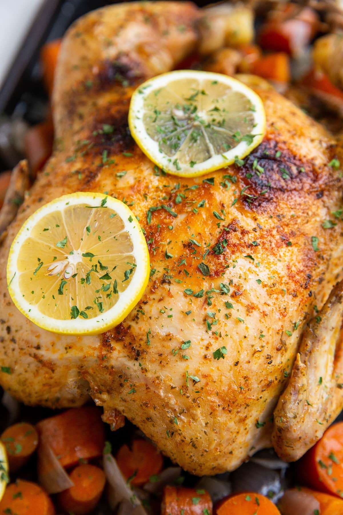 Delicious, tender juicy chicken with vegetables makes a picture perfect healthy dinner. Make it for Sunday dinner or enjoy throughout the week. This may just be the easiest whole body chicken recipe you'll ever make!