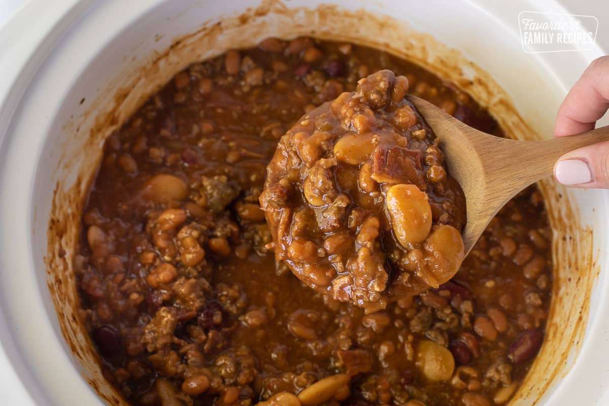 These BBQ baked beans in a crockpot are the perfect side dish for your next potluck or BBQ. They are sweet, savory, beefy, hearty, and oh so delicious!