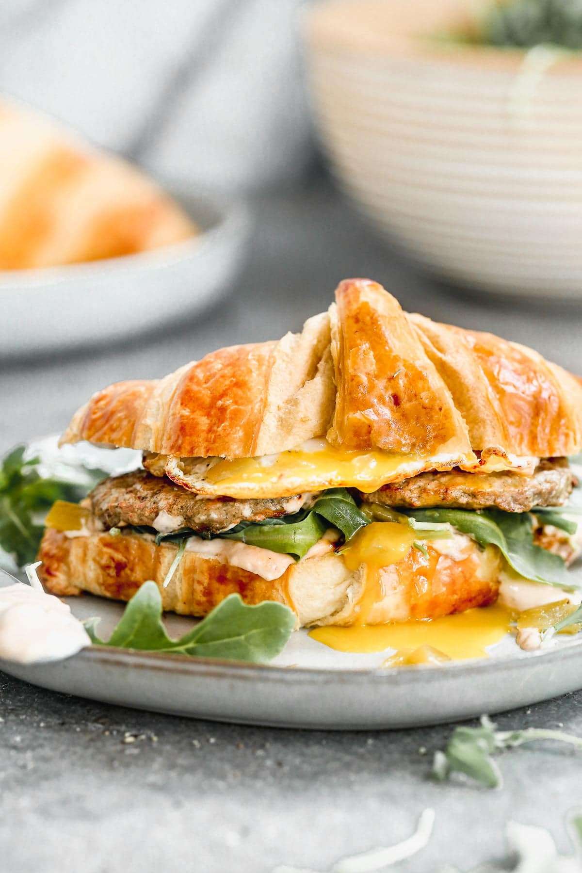 Calling all breakfast lovers! #ad Our Croissant Breakfast Sandwich is slathered with a spicy salsa cream cheese, topped with smoky green chiles, peppery arugula, salty Turkey Sausage, and of course, a drippy over-easy egg. Hearty, messy, and oh-so delicious.