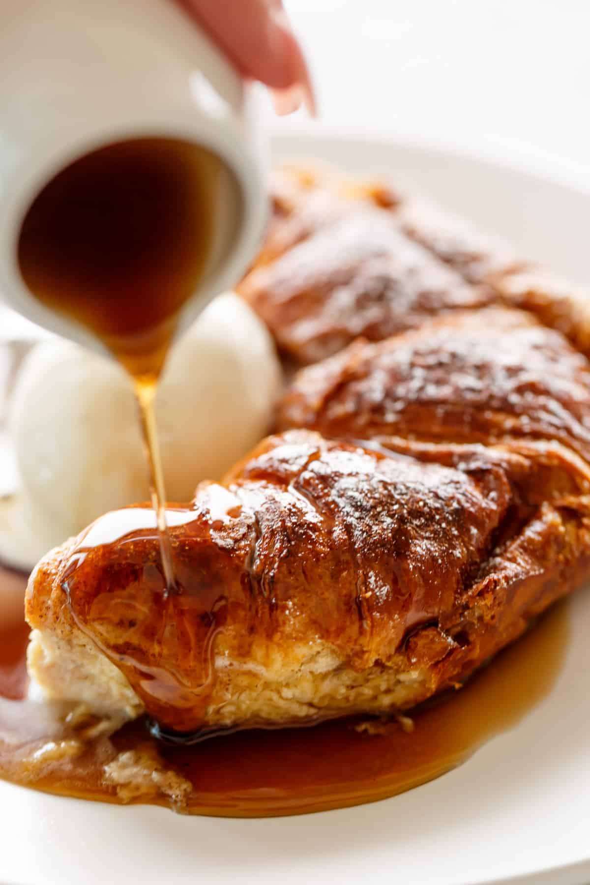 - Serve croissant french toasts warm with powdered sugar, ice cream, maple syrup and fruit (if you desire).