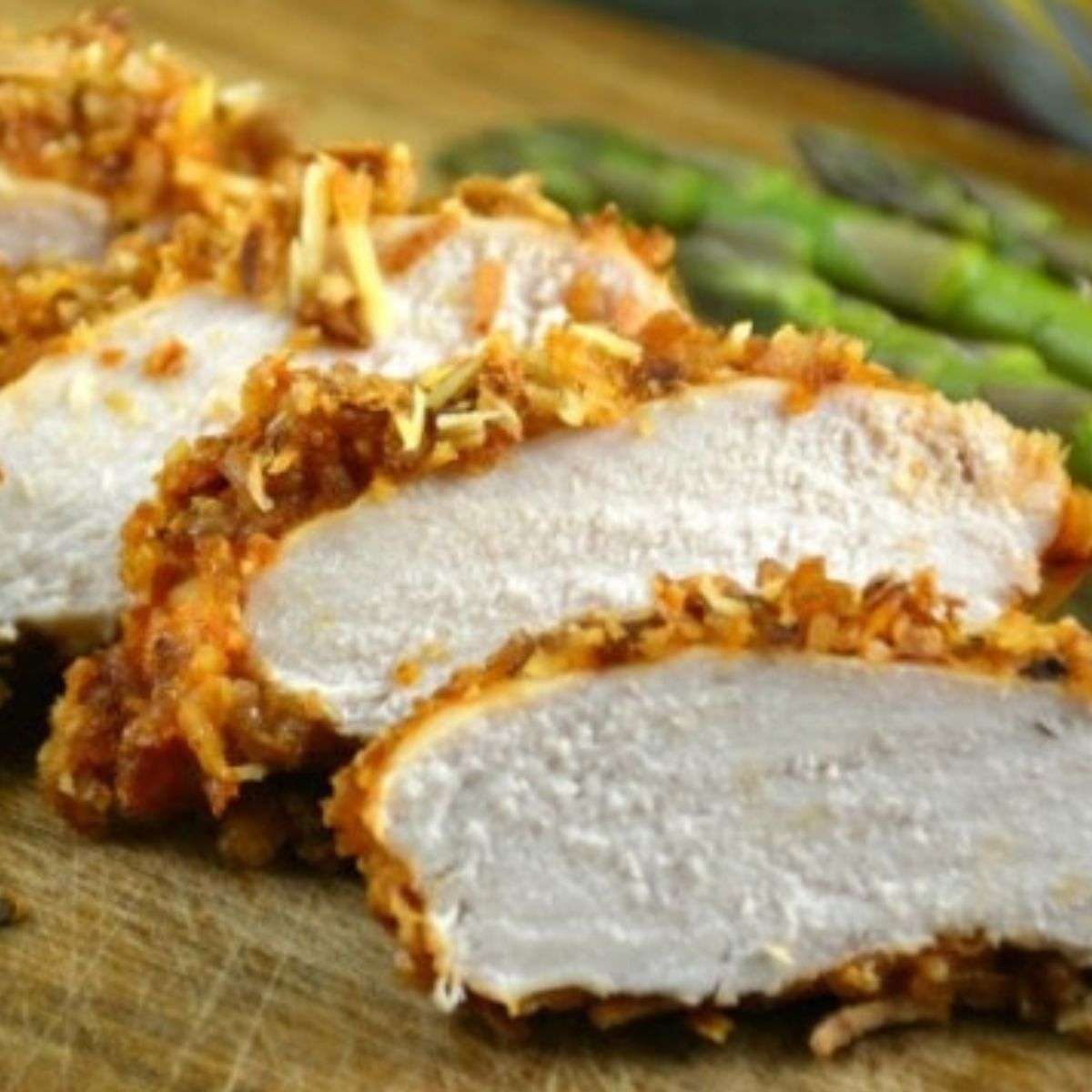 - Place barbecue sauce in a shallow bowl and mix the onions and cheese together in another. Dip your chicken in the barbecue sauce and then press all sides of the chicken breast into the crispy onion mixture. Place each chicken breast on top of your prepared pan.