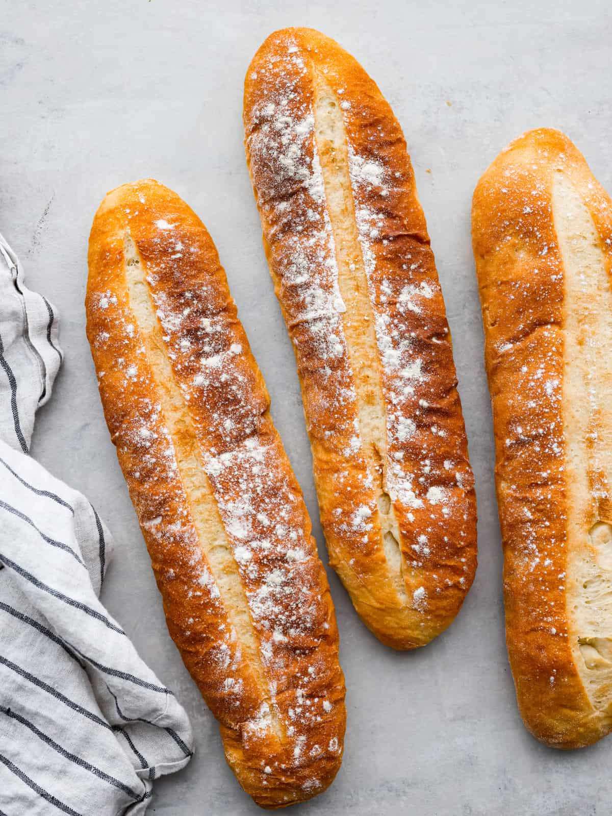 - When the loaves are ready, lightly dust with flour and make one cut on top of each loaf that runs the length of the loaf. Bake for 20-25 minutes, with one pan on the top rack and one on the bottom rack. Halfway through the bake switch the positions of the pans to ensure an even bake. Loaves should be evenly golden brown.