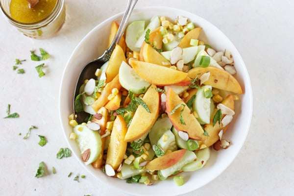 - In a large bowl, add the cucumber, peaches, corn kernels, green onion, mint and almonds. Toss to combine.