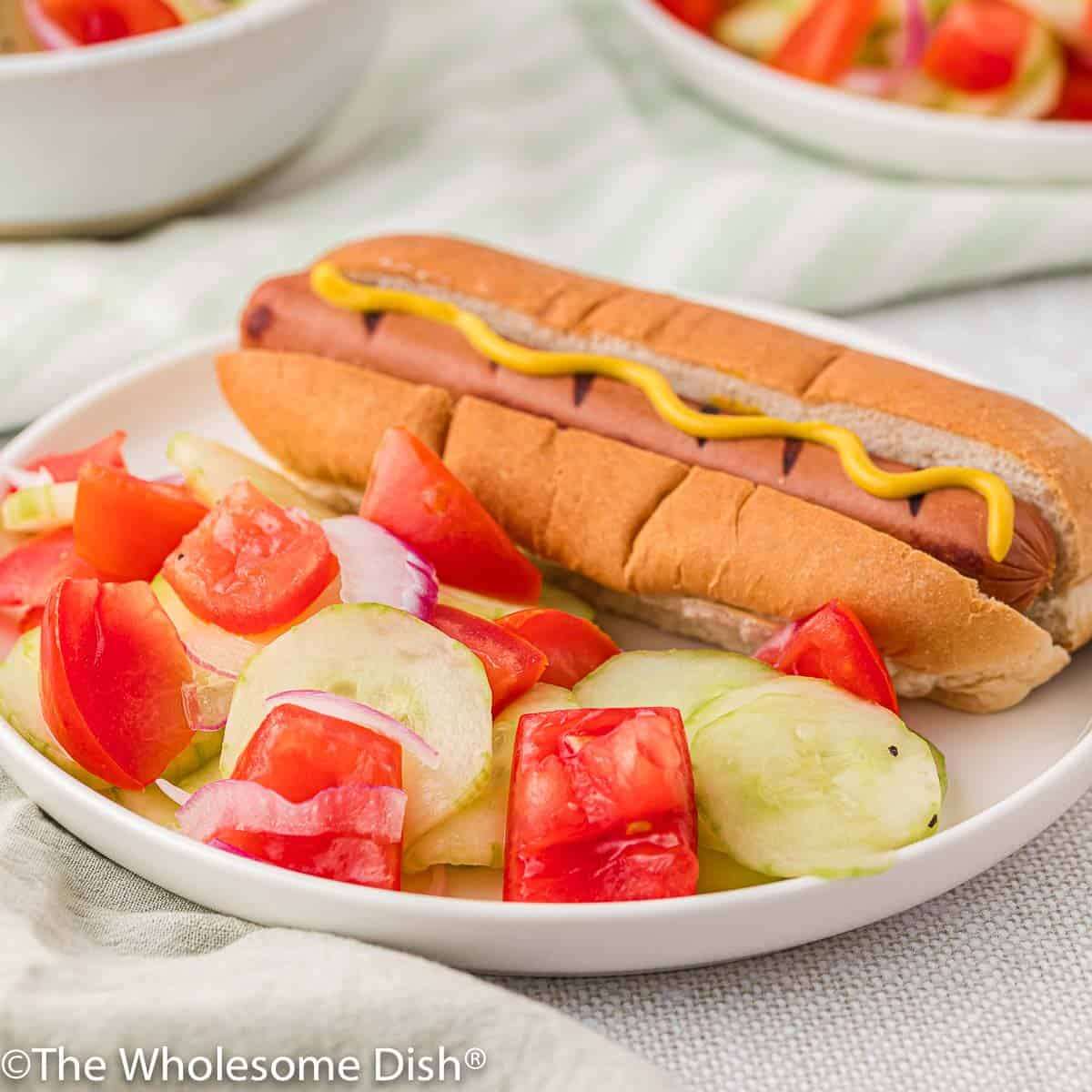 This easy cucumber salad recipe has cucumbers, tomatoes, and onions in a sweet and tangy vinegar based marinade.