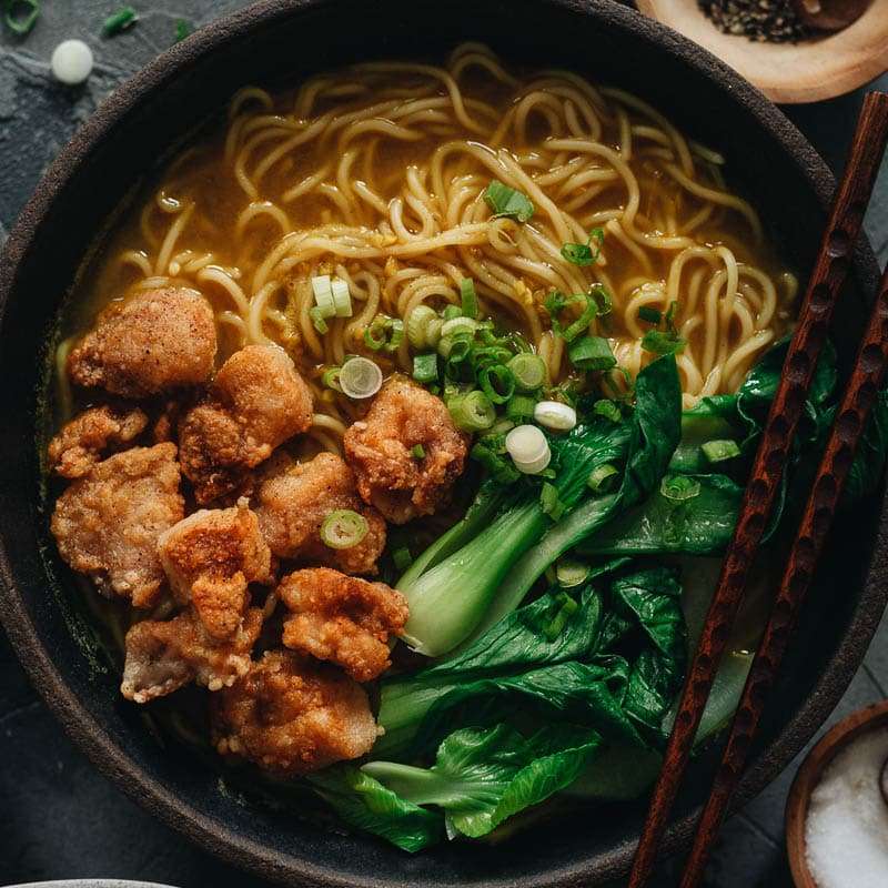Surprise your taste buds with the textural and flavorful delights of my curry noodle soup. It’s full of fragrance and topped with perfectly crispy bites of popcorn chicken and leafy green bok choy for balance!