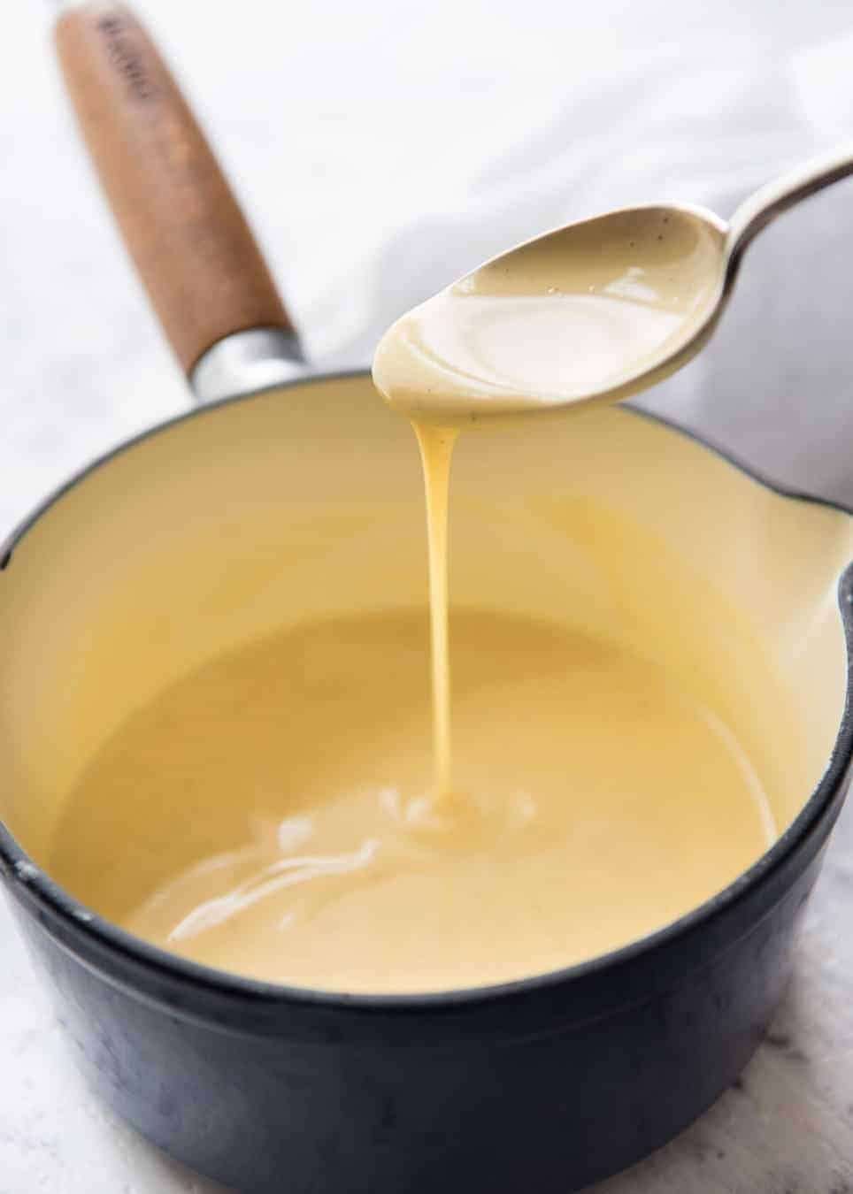 - I like to use cream with 35%+ fat because it gives the custard richness. However, this recipe will work with cream with less fat, albeit it will need to reduce a bit more to achieve the same thickness.