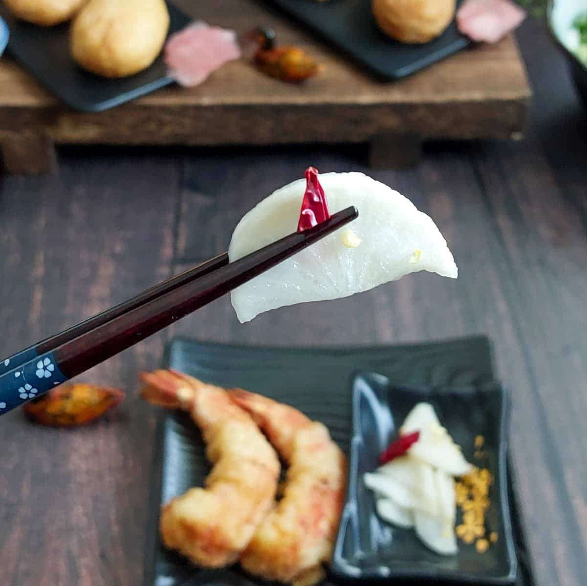 Ácido y crujiente, el daikon no tsukemono japonés es un rábano daikon encurtido que acompaña a la mayoría de los platos principales.