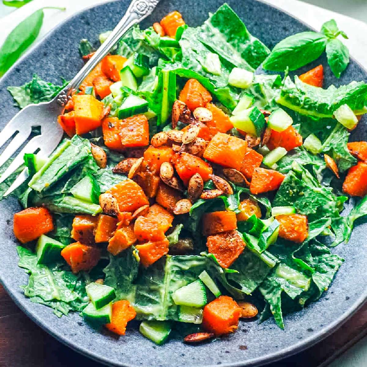 - Top the dandelions with roasted butternut squash croutons, freshly diced cucumbers, and toasted seeds.