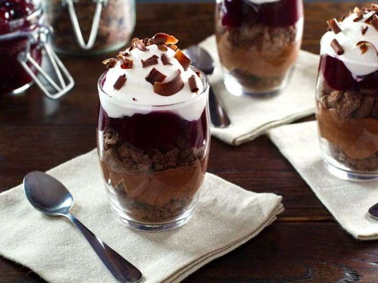 - To assemble: Place 2 tbsp of the cookies in the bottom of 8 parfait cups. Evenly distribute the chocolate cheesecake mixture between the cups. Add an additional 2 tbsp layer of the crushed cookies to each parfait. Evenly distribute the chilled cherry mixture between the cups. Divide the whipped cream evenly between the 8 cups to top the parfaits. Garnish each parfait with chocolate shavings or sliced almonds. Chill for at least 3 hours before serving, up to overnight. Make sure you top with heavy whipping cream rather than bottled whipped cream, which will deflate over time.