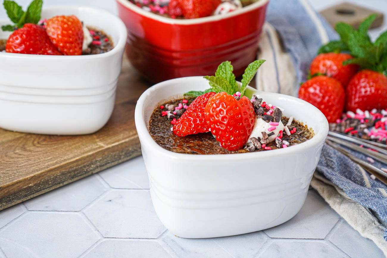 A recipe for Dark Chocolate Crème Brûlée! This creamy dark chocolate custard is topped with a layer of caramelized sugar for a decadent twist on the classic dessert.