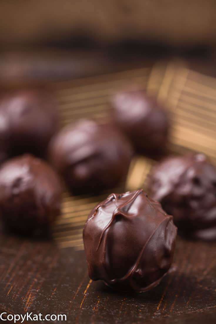 - Dip the truffle into the melted chocolate, roll the truffle around into the chocolate until it is fully coated, using a fork lift the truffle out of the chocolate and gently tap the fork on the edge of the bowl to remove excess chocolate. Place the chocolate coated truffle onto parchment paper, and let the chocolate harden.