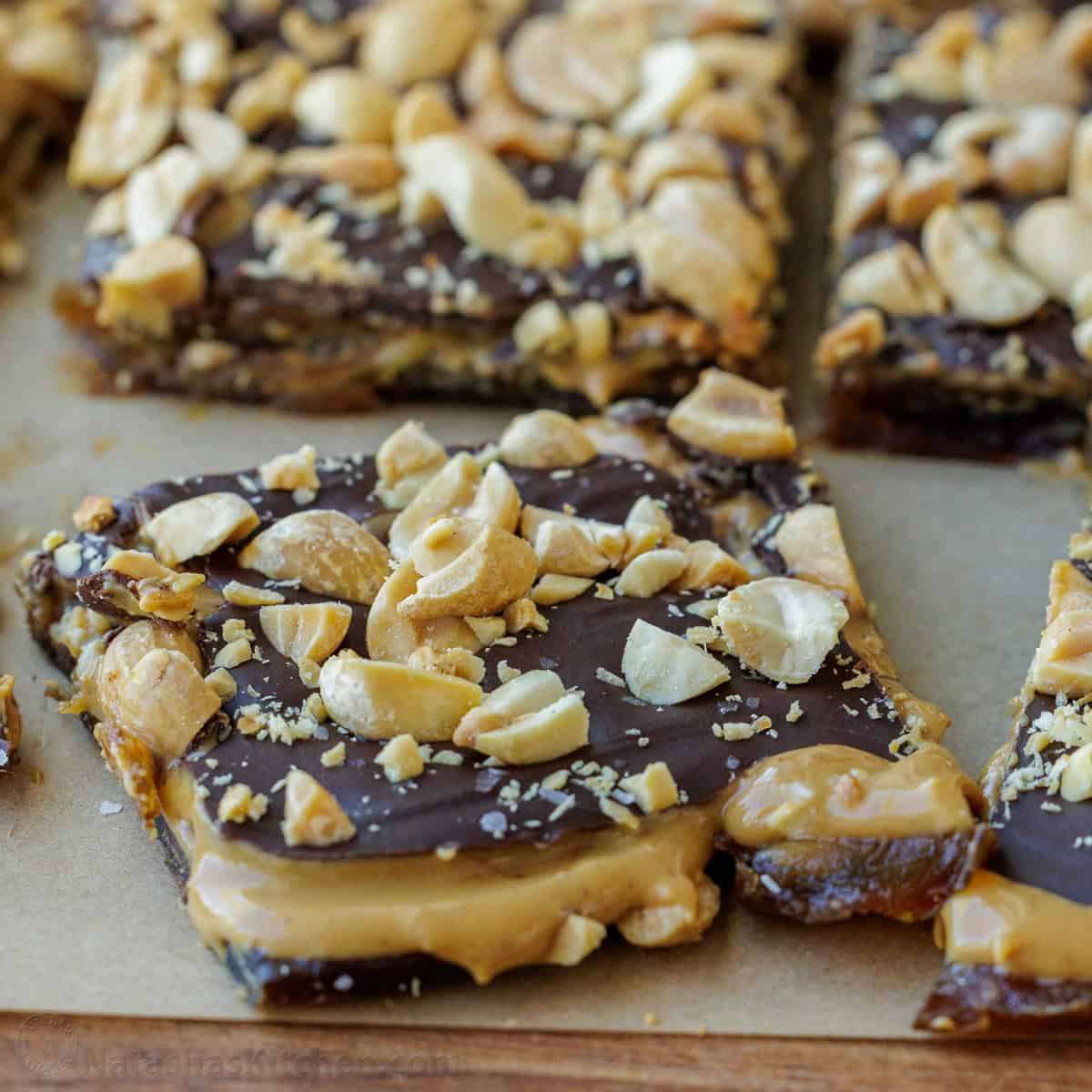 Date Snickers are a perfect candy or snack alternative, and are absolutely delicious. These no-bake treats combine peanut butter, chocolate, and peanuts layered over dates for a healthy, irresistible sweet treat you won’t want to miss.