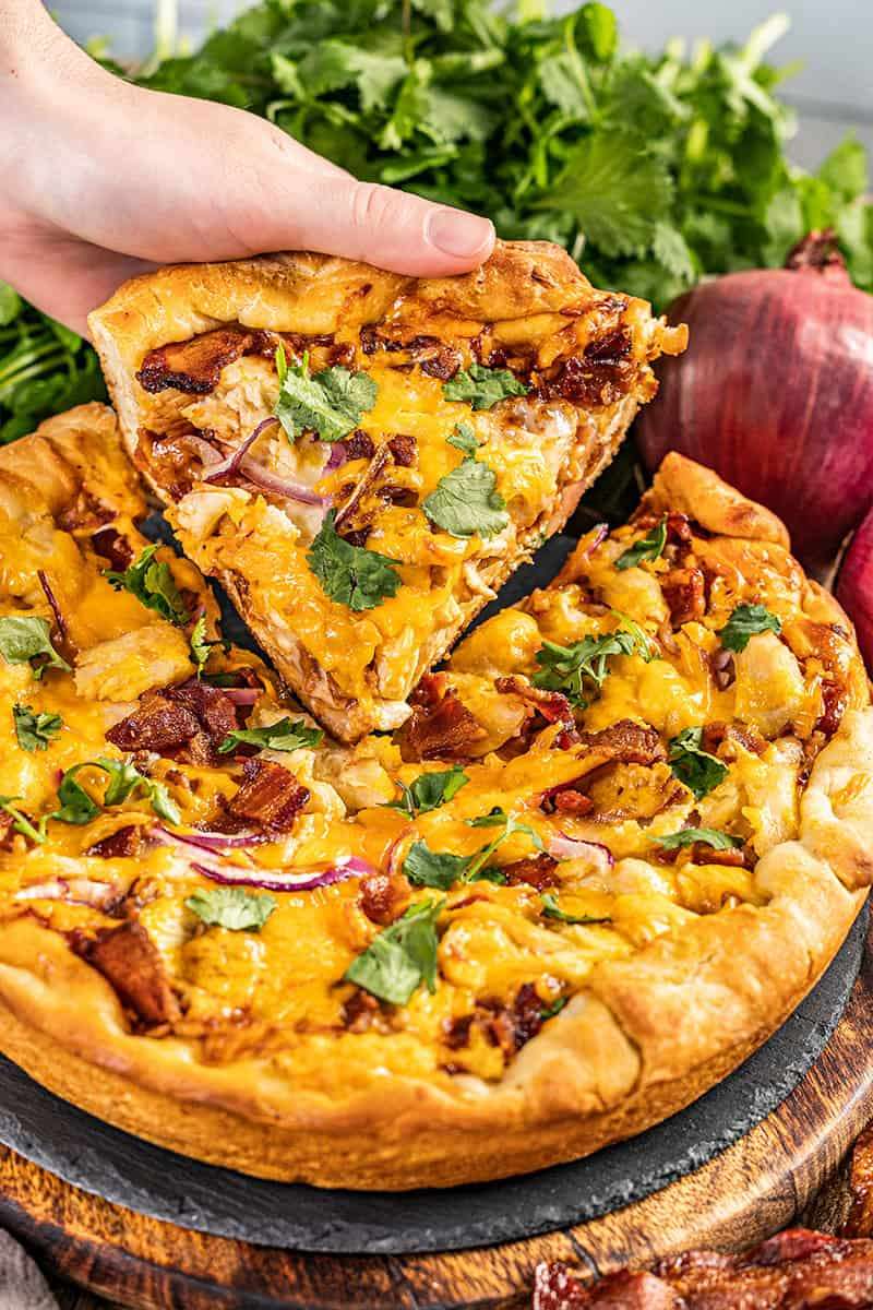 This Deep Dish BBQ Chicken Pizza is every pizza lover’s dream! Made with thick dough topped with tangy barbecue sauce, gooey cheese, tender chicken, crispy bacon, and fresh vegetables, it’s a towering layer of goodness!