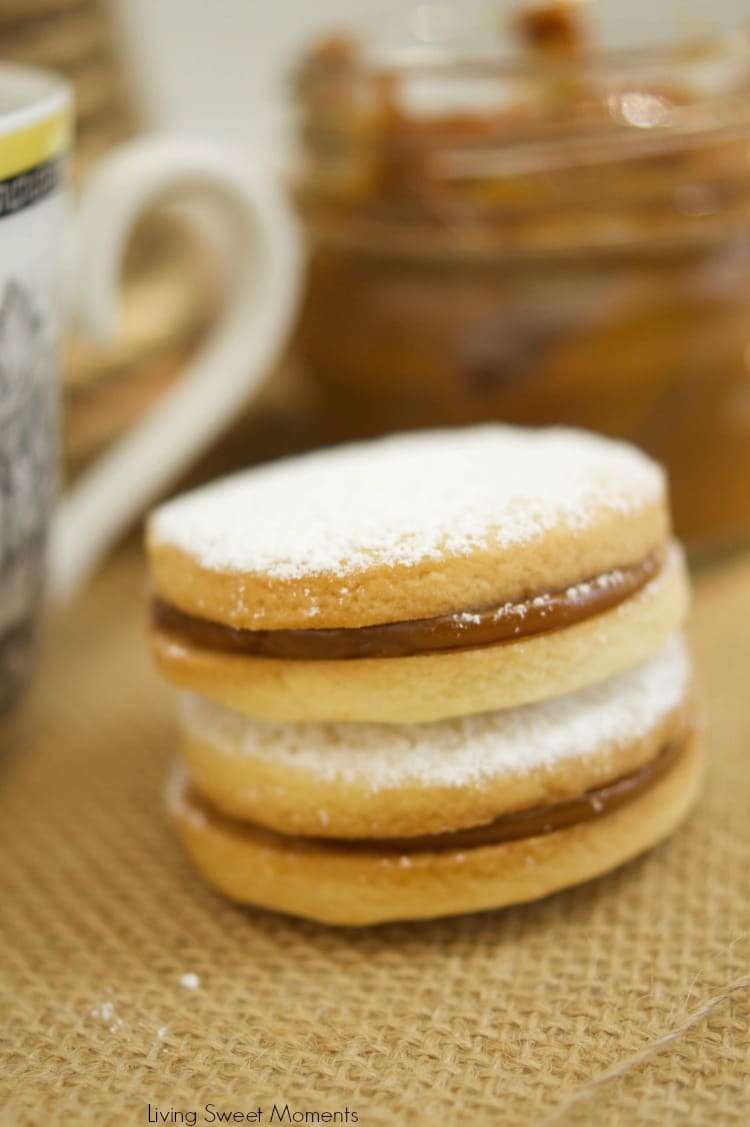 Alfajores Recipe - they are delicate shortbread cookies filled with dulce de leche. These cookies use cornstarch as a main ingredient. Great with coffee!