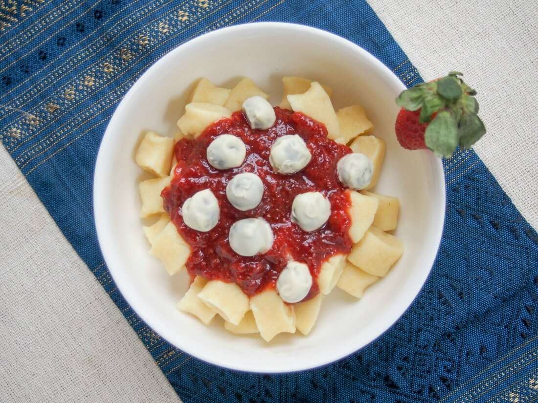 A dessert twist on gnocchi - soft pilowy dough with a delicious strawberry sauce.