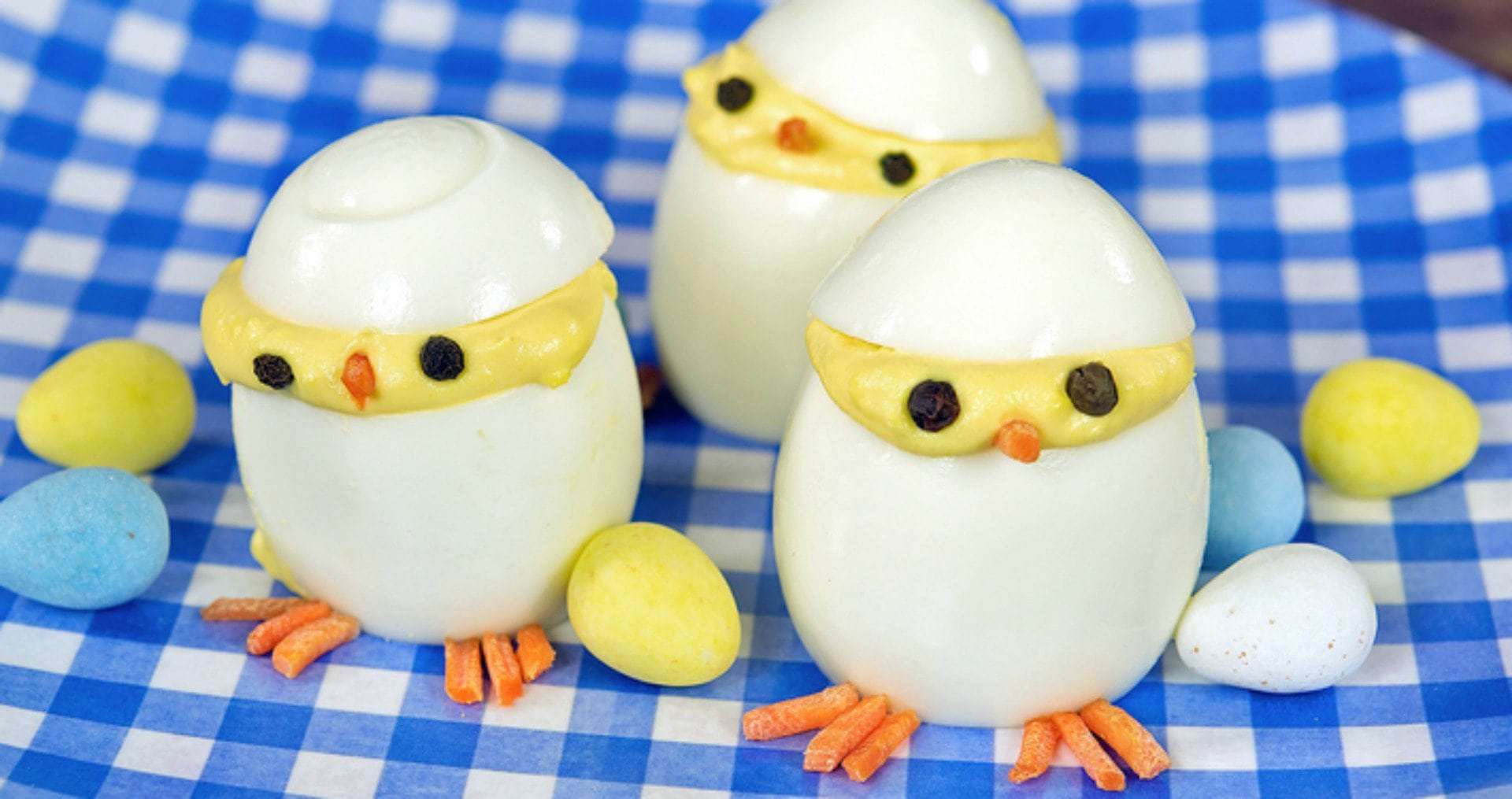 - For the eyes, cut off the ends of small raisins and press two on the front. For the beaks, thinly slice a few rings of carrot and cut triangles and press in the eggs for beaks. Add carrot matchsticks on the bottom for the feet.