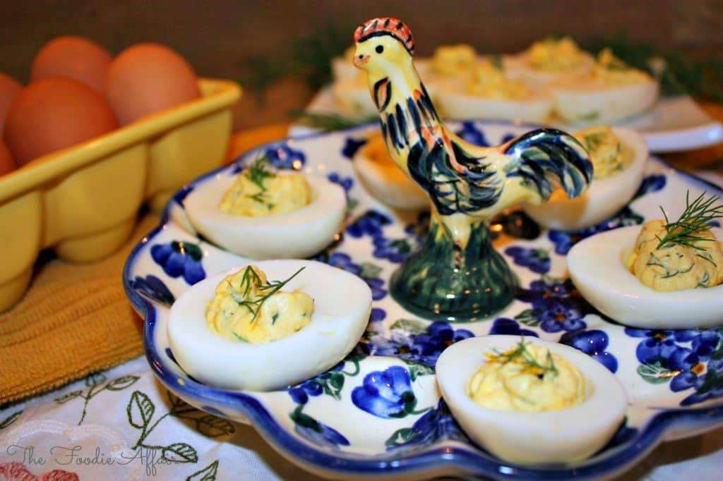 - Pipe or spoon mixture into the egg white halves adding a small sprig of fresh dill.