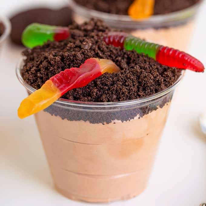 - Divide the crushed Oreos to the top of the cups. Make sure to push some crumbs under the worms as well as on top.