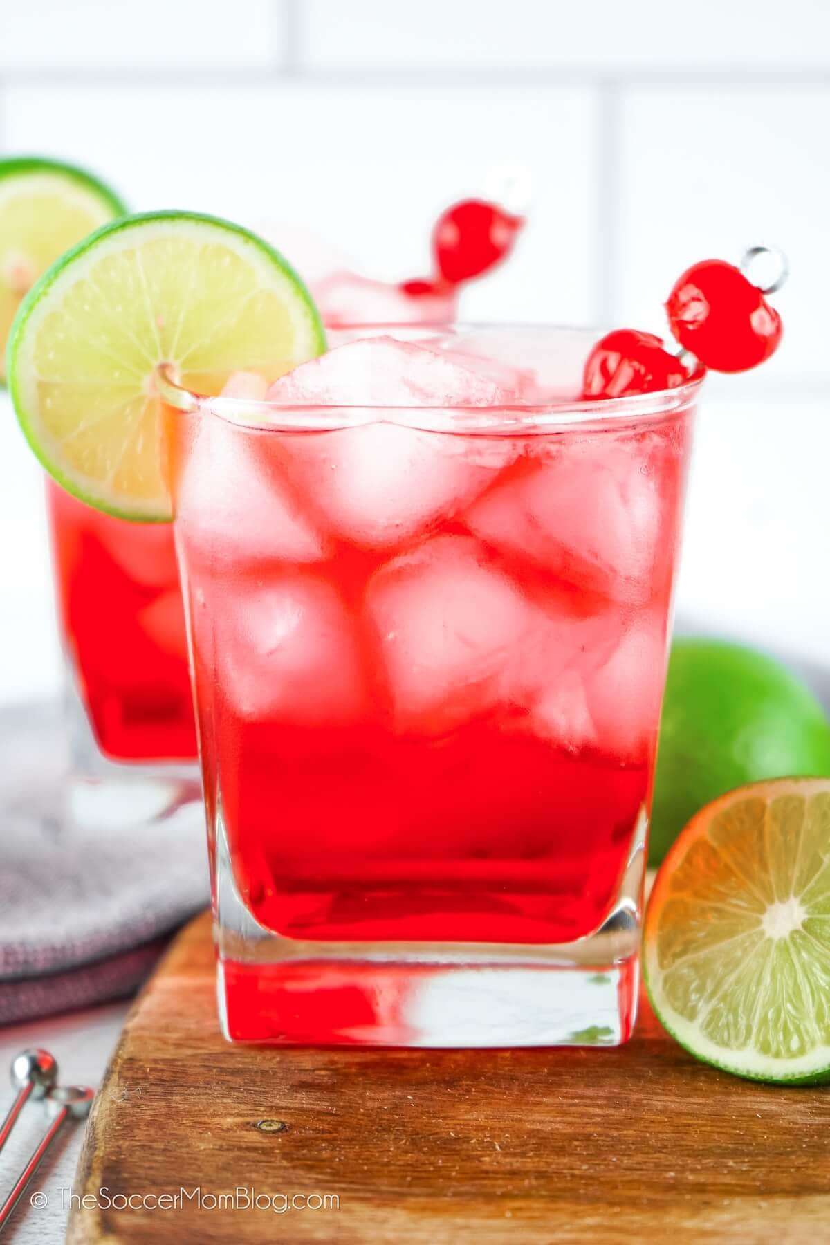 - Fill remainder of the glass with soda and garnish with a cherry.