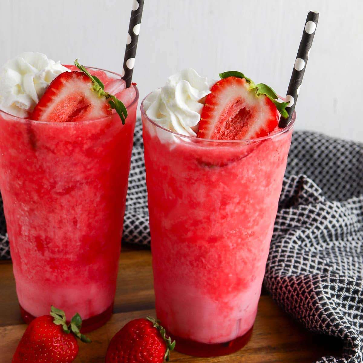 - Drizzle the strawberry syrup around the sides of the glass and over the ice.