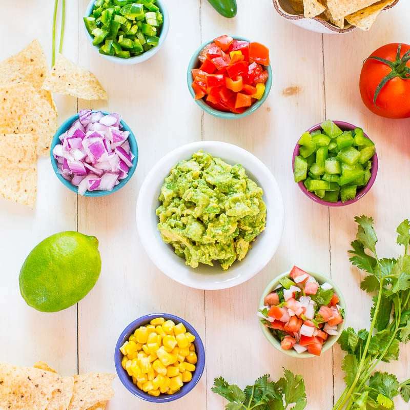 You don’t need to throw a party to create a DIY guacamole bar that any guacamole fan will love. A big tip if you just need a few tablespoons of various veggies is to buy a ‘fajita mix’ or ‘stir fry mix’ in the refrigerated case of the produce department. It’s an easy and more cost-effective way to incorporate a wide variety of veggies without having to buy a whole one of each. If you plan to do a guac bar for an event, only mash about half the avocados you think you’ll need in the beginning (I budget 1 avocado per person), and as time passes, mash as needed. Even if it doesn’t turn brown, guac turns darker and looks less appealing over time. Get creative and add what you think sounds good and I recommend washing it down with a couple of The Best Homemade Margaritas.