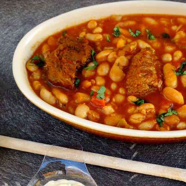 - Ajouter le concentré de tomates et l'eau, puis les haricots blancs.