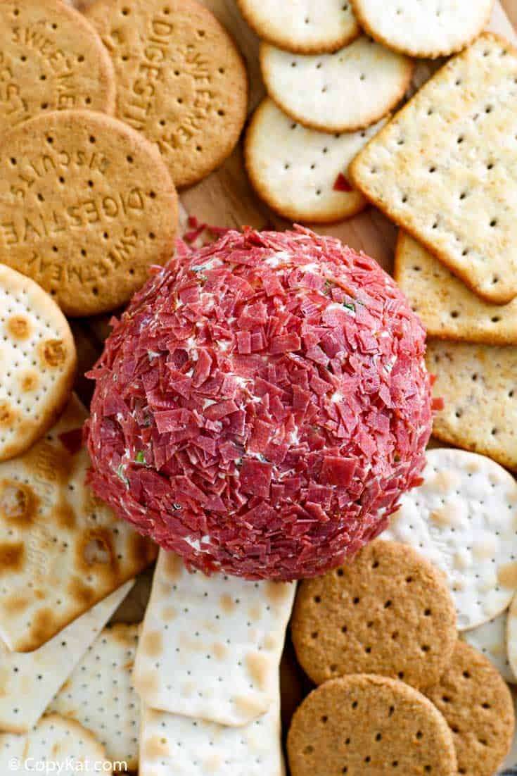 - Shape into a ball, and coat with the dried beef pieces. Chill until needed.