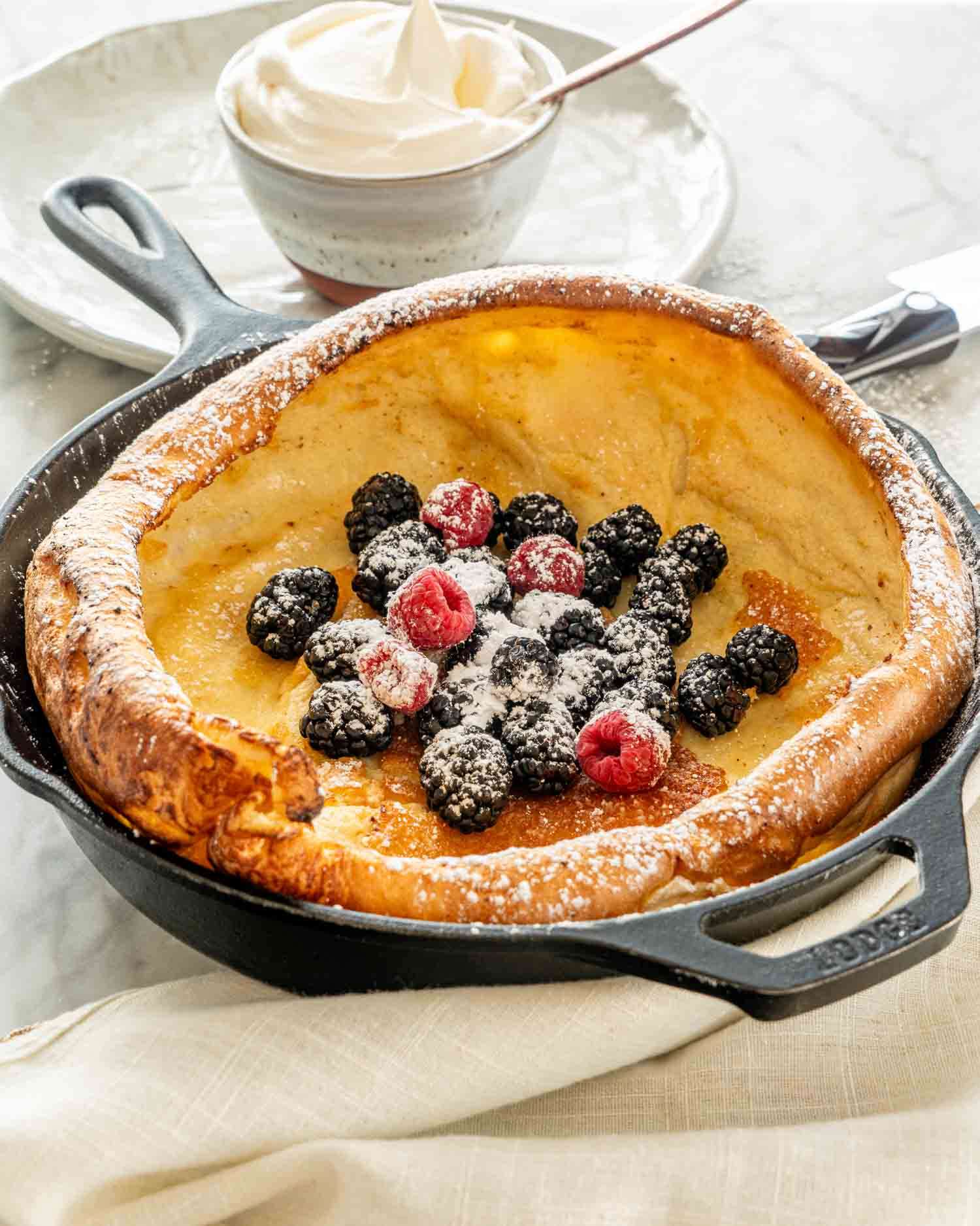 - Remove the skillet from the oven and immediately brush the pancake with melted butter and drizzle the lemon juice over the top. Add some berries and dust with powdered sugar before serving, if preferred.