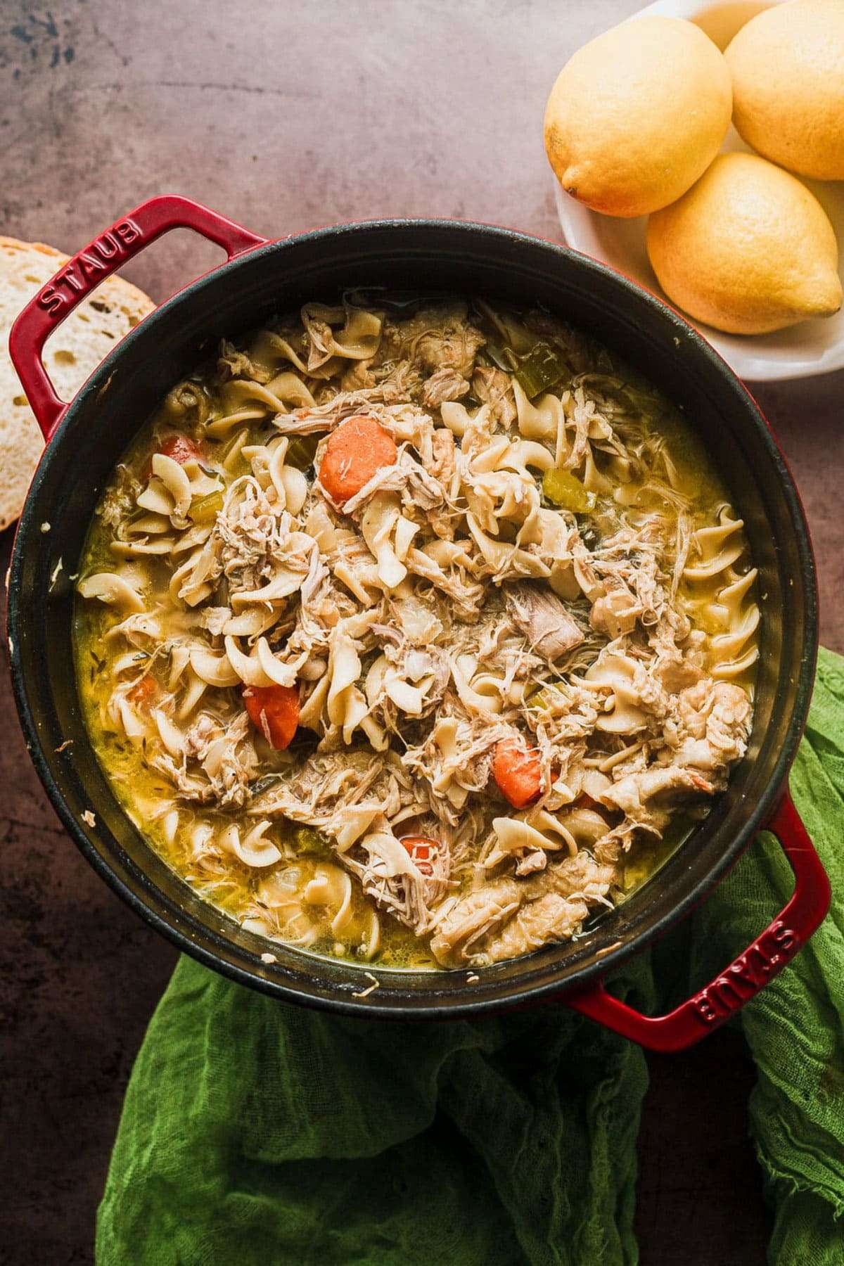 This time of year just calls out for classic dutch oven chicken noodle soup, just how grandma makes it. This recipe is exactly what you need on a cold day: made-from-scratch flavorful broth, shredded chicken, fresh herbs, noodles, and plenty of vegetables.