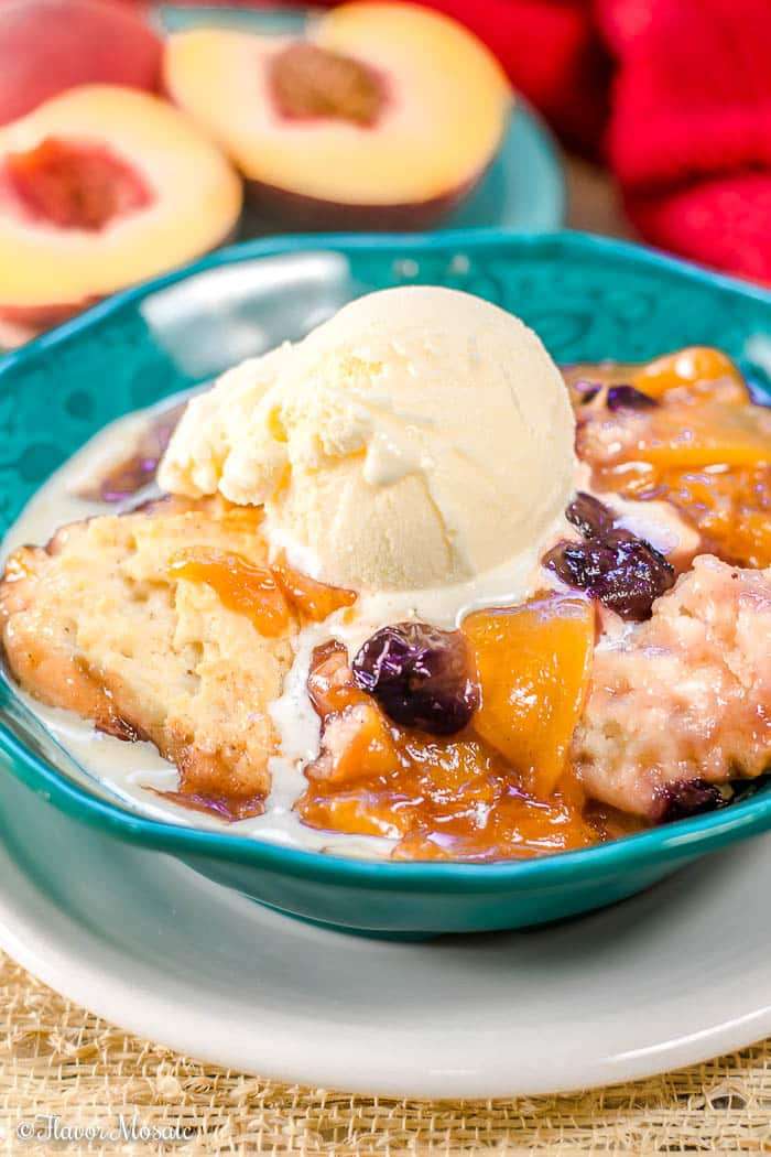 - Spoon over the top of the peach cobbler.